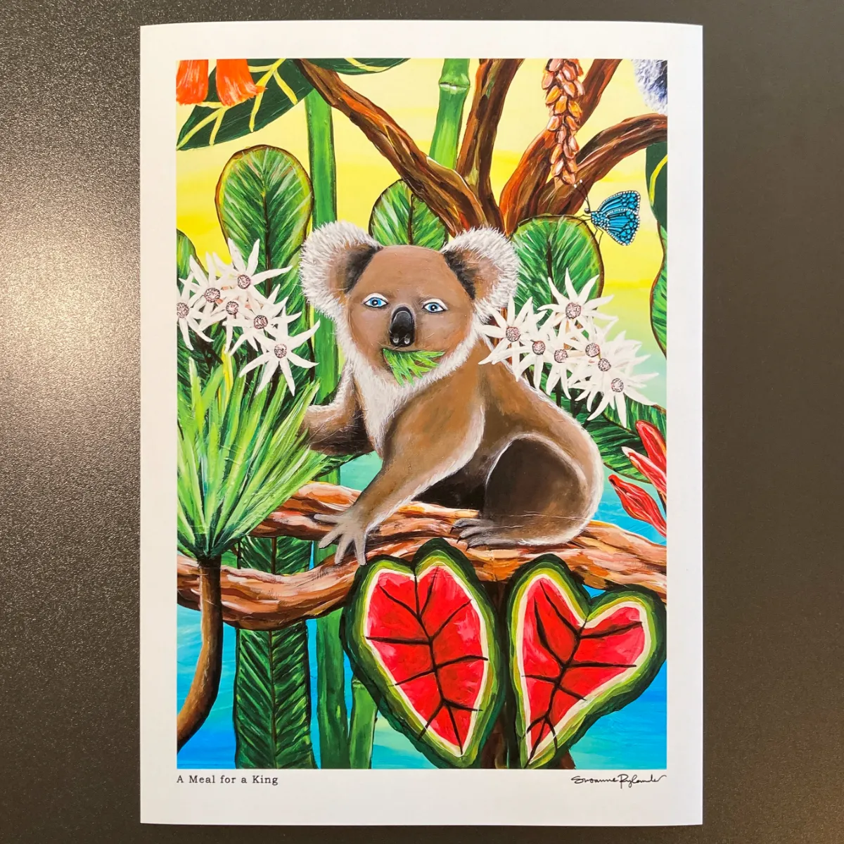 Colourful koala art print with tropical leaves and flowers. High-quality giclée wallart on matte fine art paper, available framed or unframed.