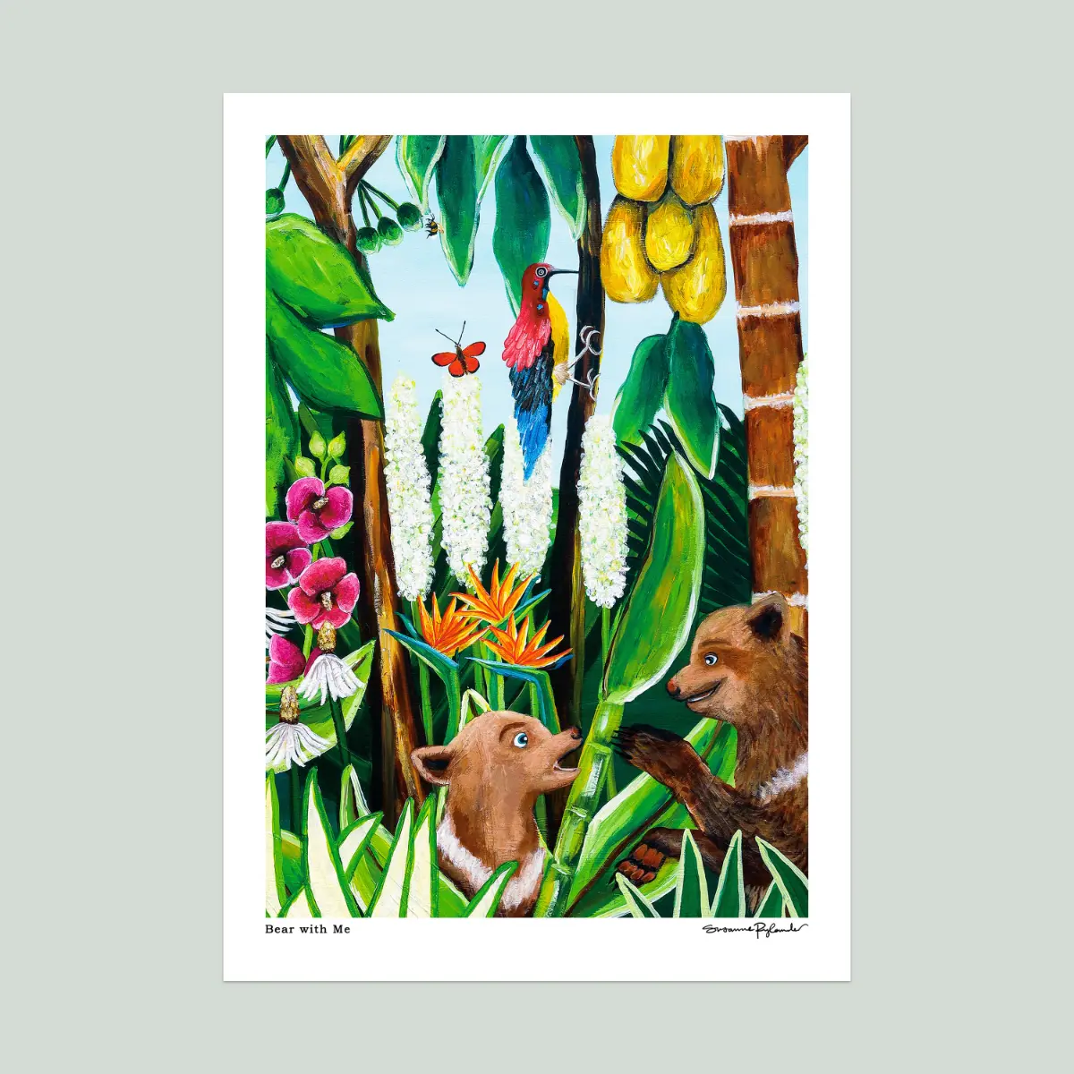 Colorful bear art print with tropical plants and wildlife. High-quality giclée wallart on matte fine art paper, available framed or unframed.