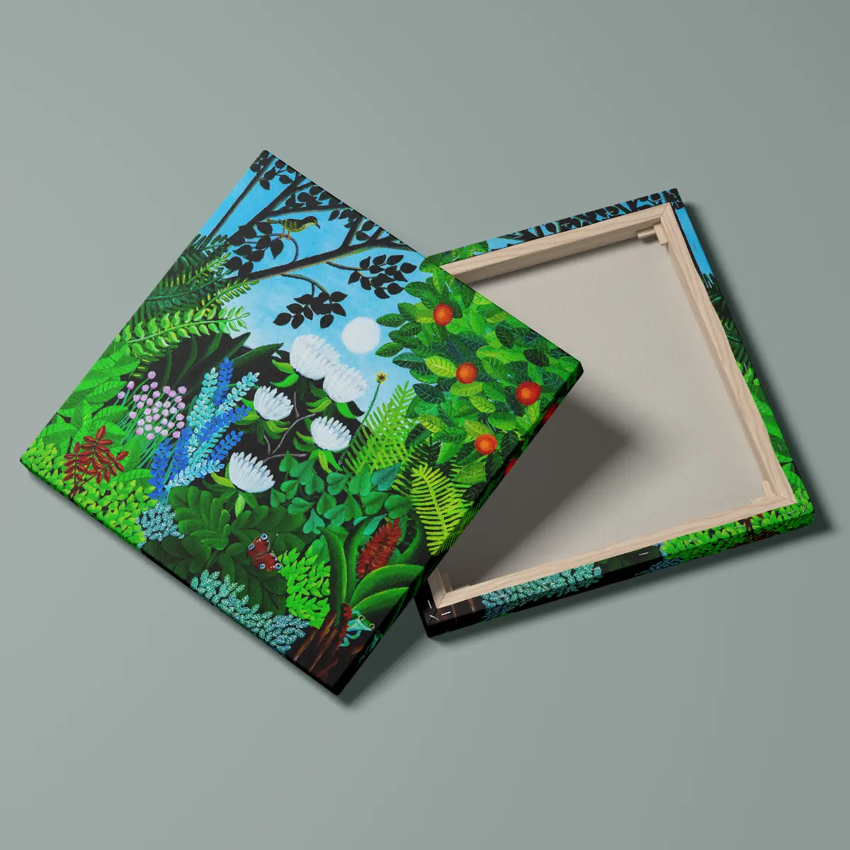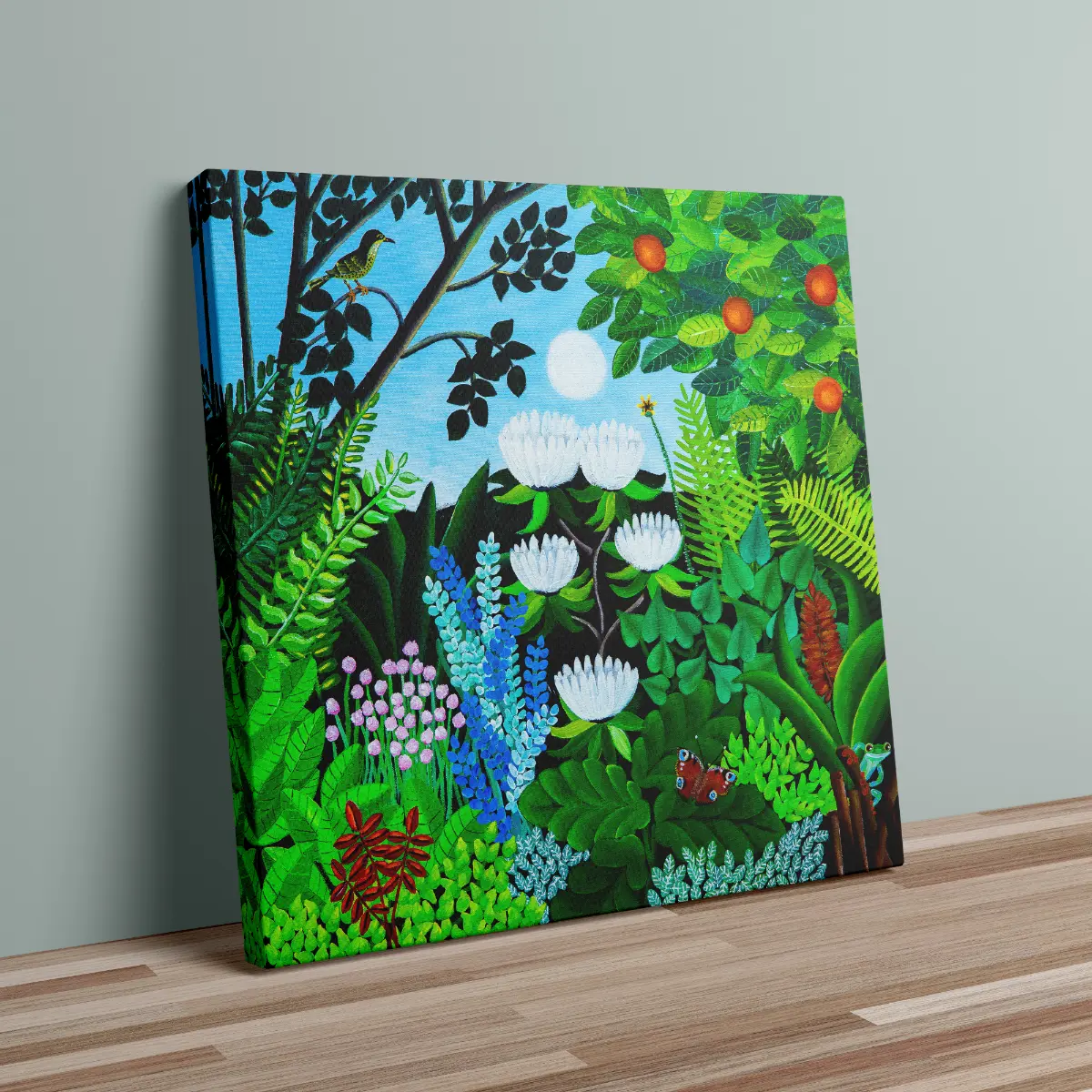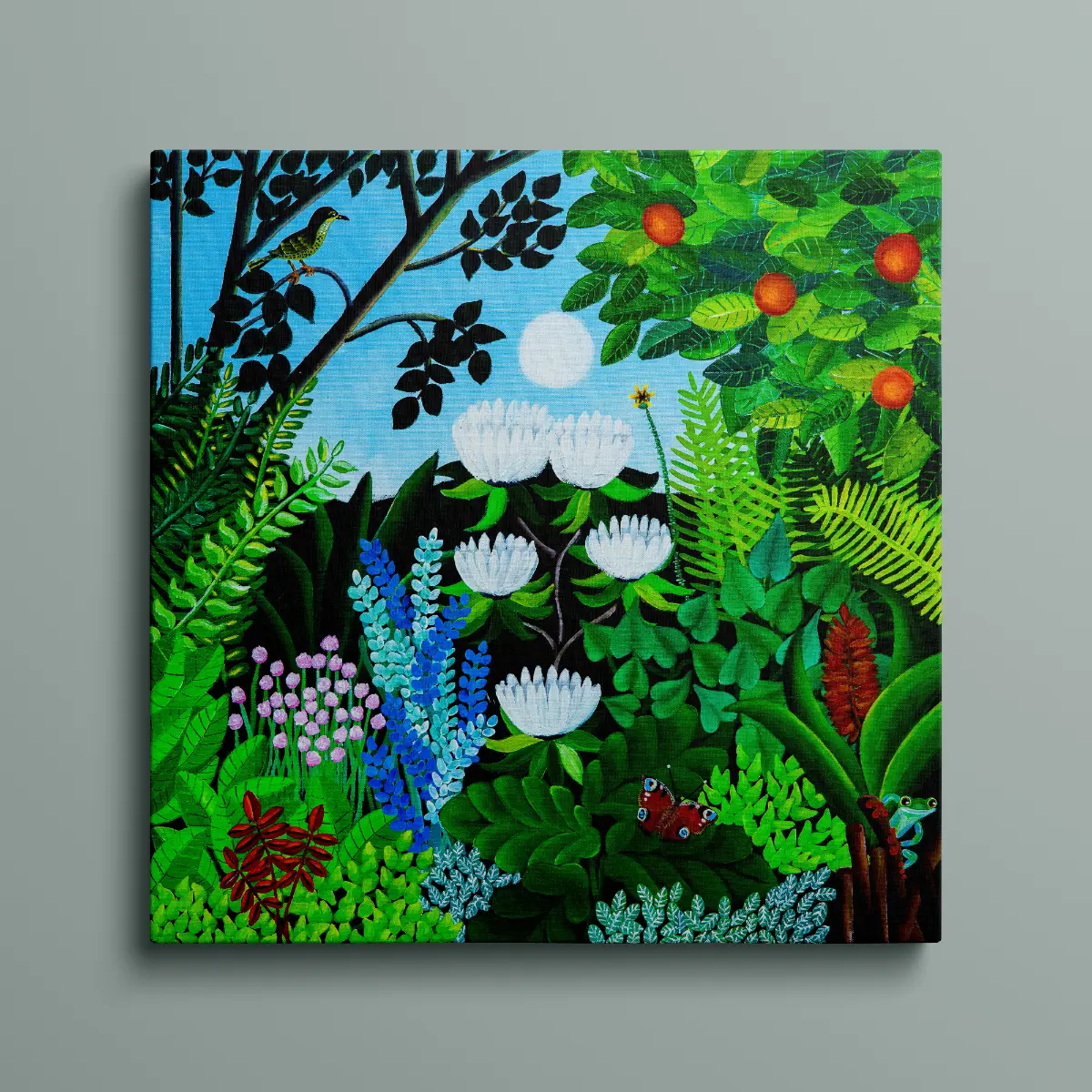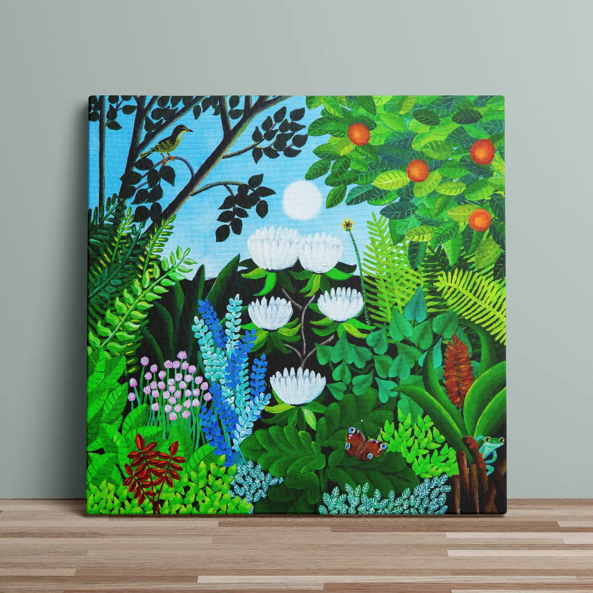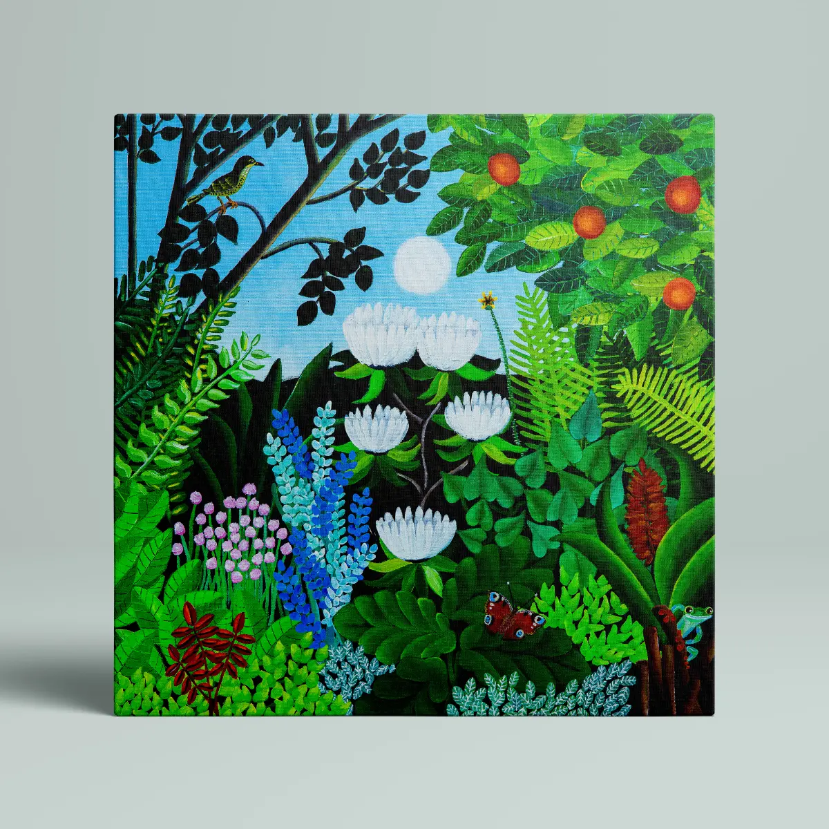 Small details such as a butterfly and a hidden frog bring life and curiosity to the art print, encouraging the viewer to explore every corner of the motif.
