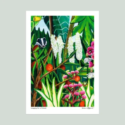 The rich green tones combined with bright floral accents make the art print an uplifting addition to living rooms, bedrooms, kitchens, or creative spaces.