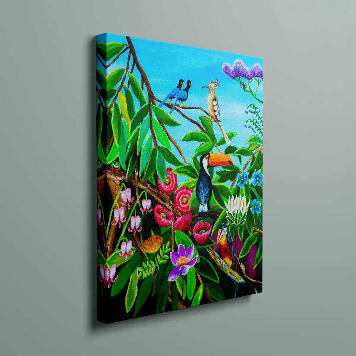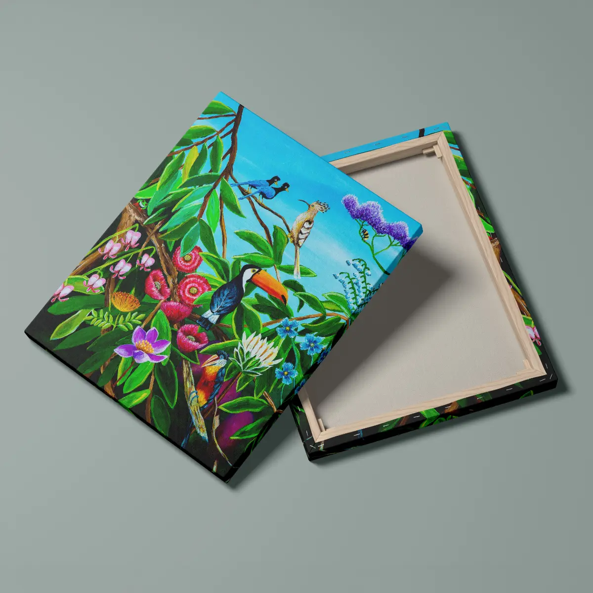 Siesta canvas print with tropical birds and flowers. Vibrant wall art print on canvas with calm nature scene and rich colors.